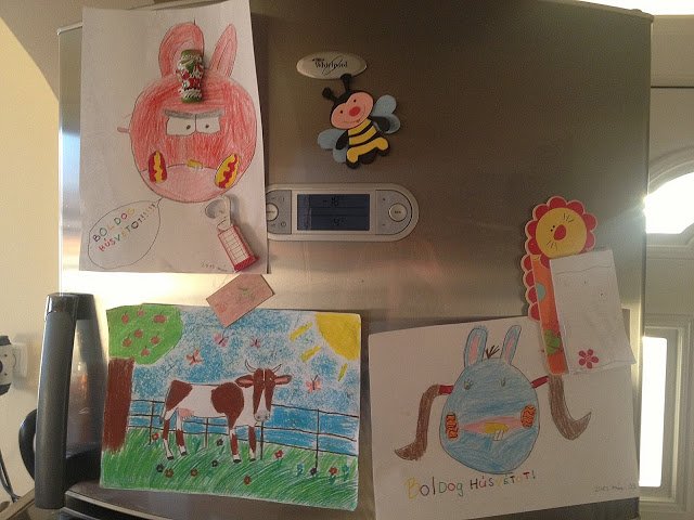 A hűtőajtón gyűlő rajzokat is megmutatom: a vérnyúl Bence alkotása, az alsó két rajz Zsófié.