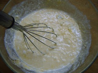 Egy edényben összekeverem a tojást a cukorral, majd hozzáadom a túrót, a tejet és az olvasztott vajat.