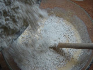 Egy másik edényben összevegyítem a kétféle lisztet (lehet persze csak sima lisztből is, de így egészségesebb), a sót és a sütőport.