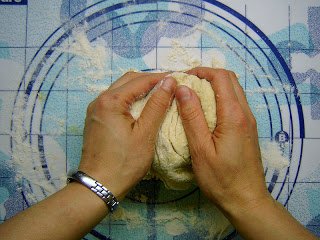 Előmelegítem a sütőt 200 fokosra, és a 10-15 perc elteltével lisztezett gyúrólapra teszem a tésztát. Ha nagyon ragacsos, annyi lisztet gyúrok még bele, amíg nem tapad már a kezemhez a tészta, vagyis nyújtható.