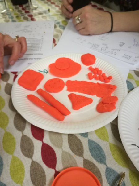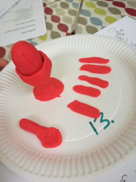 – Halmozottan hátrányos helyzetűek vagyunk itt – mondtam lányaimnak, ám ekkor olyan feladatok érkeztek, amelyekhez még a nyelvet sem lett volna fontos érteni. Minden csapat – összesen 13 volt! – kapott egy doboz gyurmát és egy papírtányért. A papírtányér aljára fel volt írva valamiféle étel, amit el kellett készíteni gyurmából. Mi a tradicionális angol reggelit kaptuk, íme: