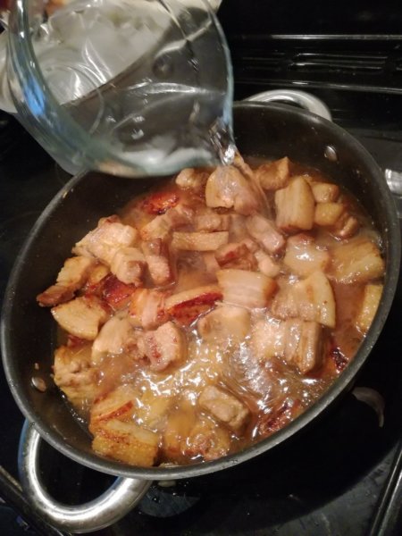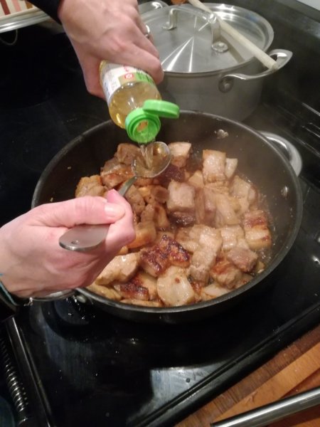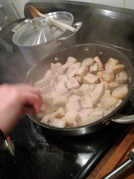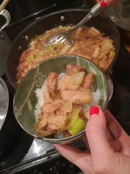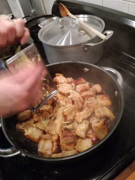Azt a receptet szeretném megosztani veletek, amit vendéglátóink, Chris és Roz először készítettek nekünk: egy japán étel volt ez, a címben is szereplő Buta no Kakuni, ami sült-párolt gyömbéres sertés hasaalja szalonna, persze rizzsel tálalva. Chrisék három évig éltek Tokióban, nagyon kedvelték az ottani konyhát, rendszeresen főznek maguknak japánt. Chris mesélte, hogy a japánok elég sok sertéshúst esznek, de nagy különbség hozzánk, magyarokhoz képest, hogy nem igyekeznek megszabadítani a húst a zsírtól. Ez az étel kifejezetten a nagyon zsíros részből készül, én hüledeztem kissé, hogy ki sem olvasztják a zsírt a húsból, hanem párolják sok-sok ideig, de be kell látnom, a végeredmény nagyon finom volt.