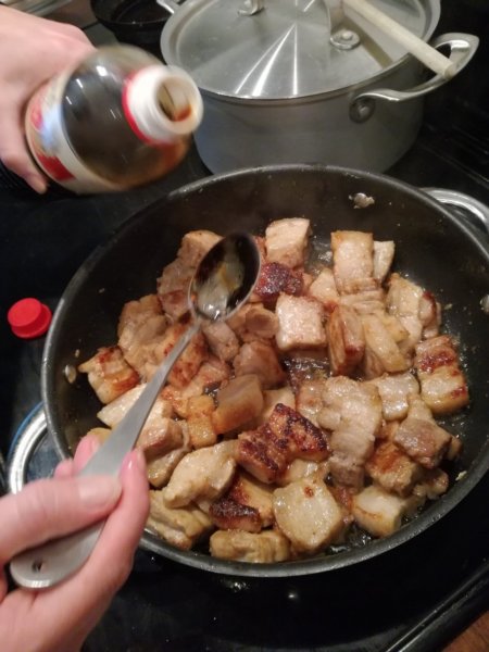 - Amikor a hús már pirul, húzzuk a serpenyő egyik oldalára, az üres felébe dobjuk bele a cukrot, és karamellizáljuk meg; aztán húzzuk vissza bele a húst, és forgassuk át. Adjuk hozzá a szójaszószt.