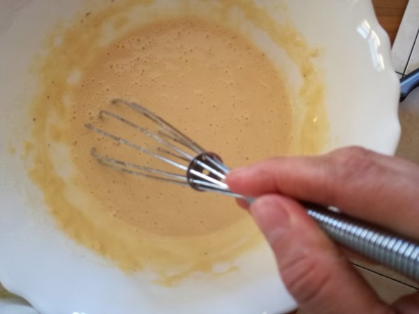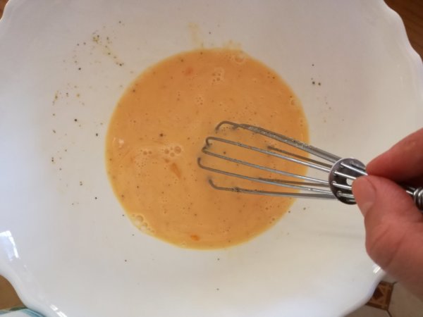 - Egy tálba ütjük a tojásokat, összekeverjük a tejjel, a sóval, a borssal.