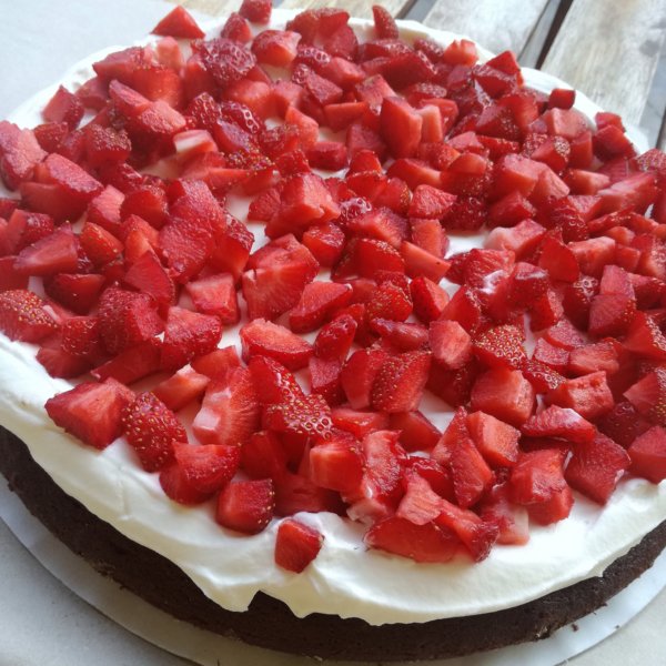 Ezeket így együtt habbá verjük – igen, a tejszínbe tesszük a mascarponét, a cukrot, és robotgéppel habbá verjük. A tortaalapunkra kenjük. Tetszés szerinti mennyiségű eperrel beborítjuk.