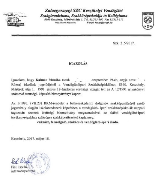 Többször volt már tanulóm az üzemben, felnőttképzésben résztvevők, mivel ott nem szükséges, hogy a gyakorlati oktató mestercukrász legyen. Mert én nem vagyok az. Soha nem volt semmi probléma, egészen mostanáig: jelentkezett egy fiatal lány, hogy nálam szeretné tölteni a gyakorlatát. Beleegyeztem, és átküldtem a szükséges papírokat, így a végzettségemet igazoló érettségi bizonyítványt. Így néz ki: