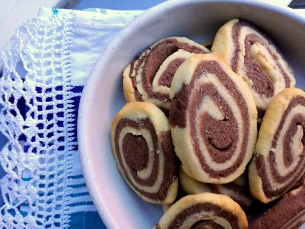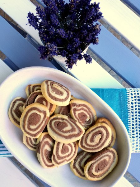 3. Egyforma téglalappá nyújtjuk mindkét tésztagombócot, majd egymásra helyezzük és feltekerjük. Hűtőbe tesszük fél-egy órára.