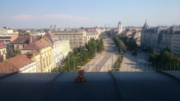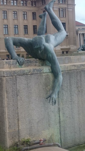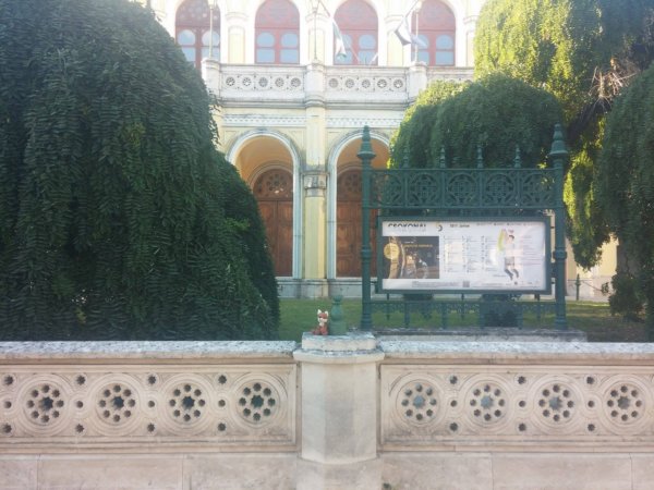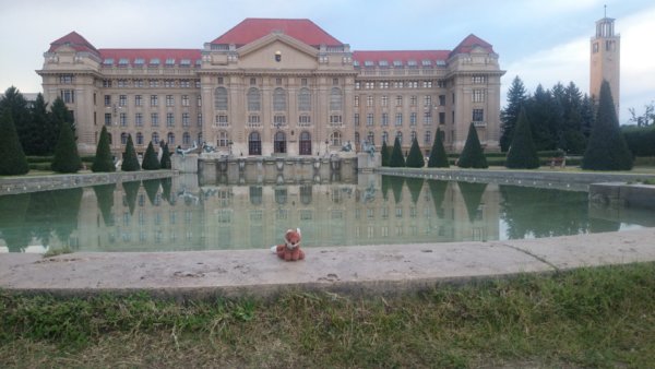 Hunor tehát szokásos dekadenciájával kezdte meg debreceni kirándulását, először az egyetemet tekintette meg. Az első kép annál a szökőkútnál készült, amelyben a friss diplomások szoktak megmártózni.![]()