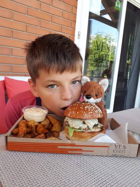 Itt pedig már névnapi vacsoráját fogyasztja Teóval: adalékanyagmentes, kézműves burgert Újkígyóson, a Yes Chef-ben.