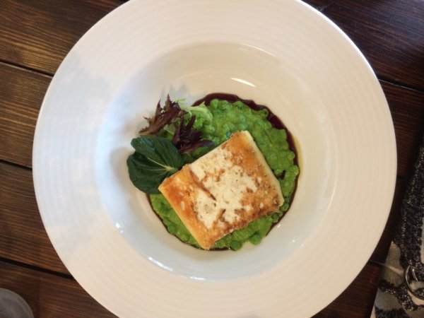 Ez itt grillezett kecskesajt és zöldborsó főzelék. A főzelékben nincs habarás, a pürésített borsóval sűrítették be.