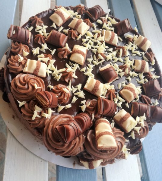 3. Összeállítjuk a tortát: az alsó lapot tálra helyezzük, rákenjük a félretett maradék mogyorókrémet, arra a világos krémet. Jöhet a következő lap, és a mogyorókrémes töltelék kétharmada. Harmadik lap: erre csokiganache kerül. Ehhez forrósítsuk fel a tejszínt, tördeljük bele az étcsokit, és kevergessük addig, amíg szép fényes, sötétbarna masszát nem kapunk. A maradék krémmel kenjük körbe a torta oldalát, majd ezt követően vonjuk be a ganache-sal a tortánkat. Kinder Bueno-darabokkal, csokiforgáccsal díszítjük.