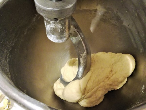 1. A tejet langyosítsuk meg, tegyünk bele egy evőkanálnyi cukrot, és morzsoljuk bele az élesztőt. Amíg felfut – azaz felhabosodik az élesztő a tej felszínén -, addig mérjük a robotgép üstjébe, ennek hiányában egy tálba a lisztet, a porcukrot, a sót, adjuk hozzá a többi hozzávalót is, és dagasztassuk be a tésztát a géppel, vagy gyúrjuk be mi magunk. Szépen álljon össze a tészta, ne legyen nyúlós-ragacsos, ha mégis az, akkor adjunk hozzá egy kevés lisztet. Szép gombócot formáljunk belőle, lisztezzük meg a felületét, takarjuk le egy konyharuhával, és hagyjuk kelni úgy egy órán át. Nem fog nagyon megnőni, a sok vaj nem engedi.