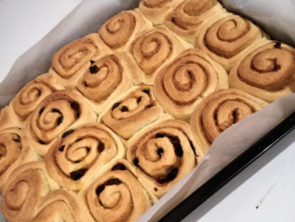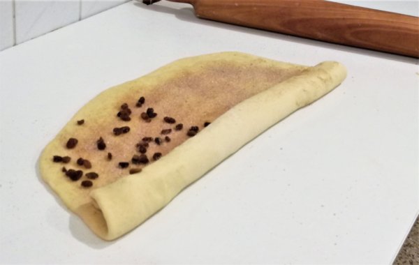 2. Ha magkelt a tésztánk, nyújtsuk ki szép nagy téglalapra, olyan 3 mm vastagra. Kenjük meg az olvasztott vajjal,és szórjuk meg a cukorral elkevert fahéjjal. Most mehet rá a mazsola is, aminek jót tesz, ha előzőleg rumba áztatjuk. (Én csak a tészta felére szórtam, mert nem mindenki szereti.)