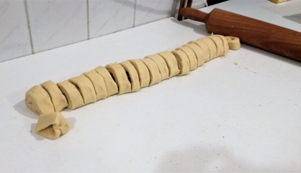 4. A tekercset szeleteljük fel, ilyen kb. másfél centis darabokra.