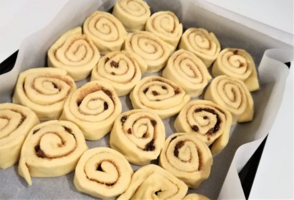 5. Tegyük a csigákat sütőpapírral borított tepsibe ilyen lazán egymás mellé. Kapcsoljuk be a sütőt 190 fokosra (alsó-felső), amíg melegszik, addig még kicsit pihennek a csigáink. Aztán süssük meg őket úgy 20-25 perc alatt.