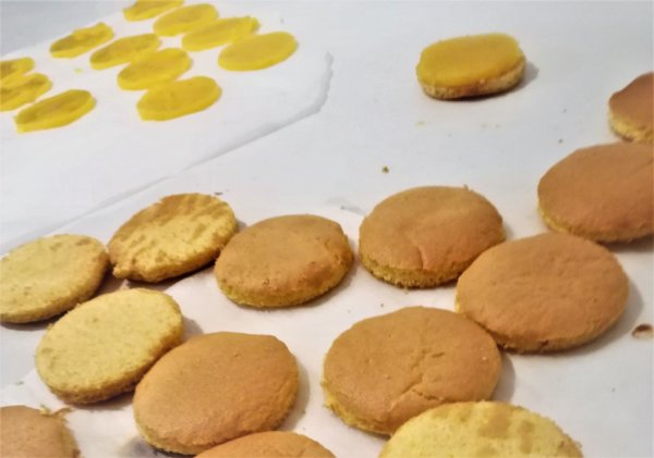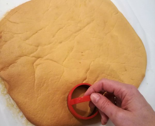 - Vegyünk elő egy kisebb és egy nagyobb pogácsaszaggatót – túl nagy különbség ne legyen a két forma között. A nagyobbal szaggasunk köröket a piskótából, a kisebbel a zseléből. A maradék zselét újra felolvaszthatjuk, és egy kisebb edényben újra dermeszthetjük.
