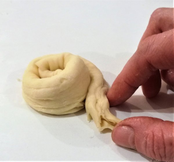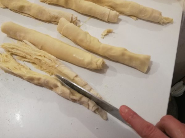 3. Amikor a tészta megkelt, elővehetjük ritkán használt tésztagépünket. Én mondjuk viszonylag gyakran használtam az enyémet, mígnem egyszer kölcsönadtam, és valami történt vele, mert azóta nem működik jól. Olyannyira, hogy újra és újra próbálkozom, és újra és újra síkideg leszek közben, hogy minek is adtam kölcsön, nem az első eset, hogy elrontva kapok vissza valamit, persze, ígérték, hogy hoznak helyette másikat, de annak már több mint egy éve. Szóval, a kelt tésztát 6 gombócba osztjuk, és egyesével kinyújtjuk a gombócokat a tésztagéppel a legvékonyabb fokozatig vékonyítva – az enyémen a 7-es a legvékonyabb. A hosszú sávot lekenjük a lágy vajjal, majd felcsavarjuk. Ilyen hengereket kapunk, csak vastagabbakat. Én ugyanis a gép hibája miatt kisebb tésztadarabokkal dolgoztam. (Minek is adtam kölcsön?!)