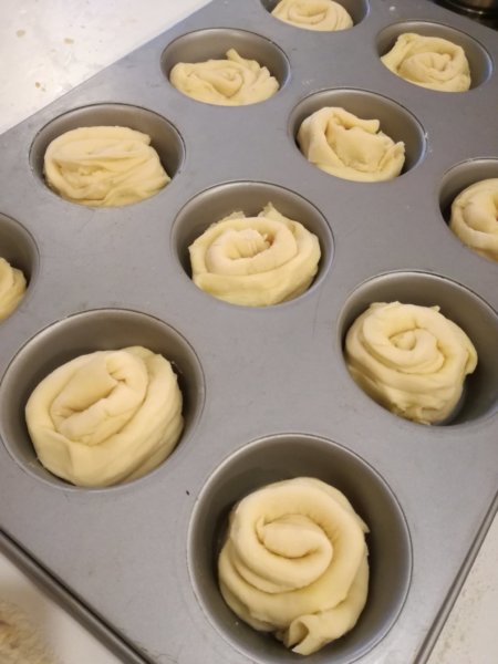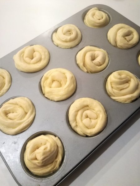 5. A félbevágott hengereket a réteges felükkel kifelé feltekerjük csiga formára, és a muffin tepsi mélyedéseibe helyezzük.