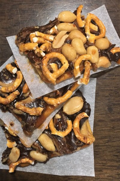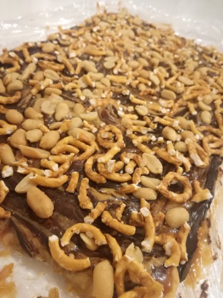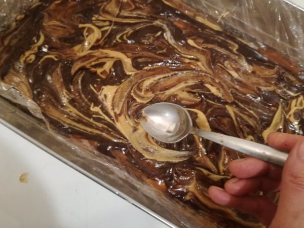 3. A tepsi aljába folpackot terítünk, lerakjuk a kekszet. Megkenjük a karamellel.