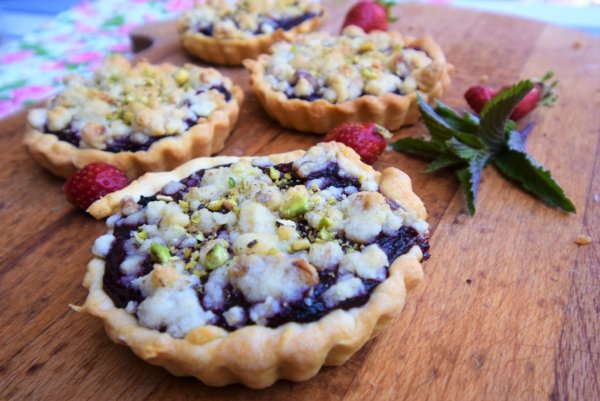 2. Tegyük a fagyasztóba a kosarakat 15 percre, közben készítsük el a morzsát, ami a kosárkák tetejére kerül: ehhez 10 dkg lisztet, 8 dkg vajat és 6 dkg cukrot dörzsölgessünk a két tenyerünk között addig, amíg morzsás állagot nem kapunk. ha ez megvan adhatunk hozzá maréknyi durvára tört diót, vagy pisztáciát.