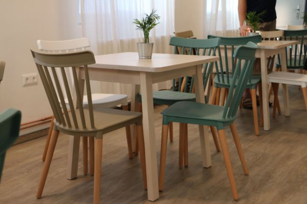 A szalag átvágása előtt egy fotó az üres belső térről: végül az Ikea Norrakker nevű asztalánál döntöttük, a székeket pedig a butopea.com-ról rendeltük.