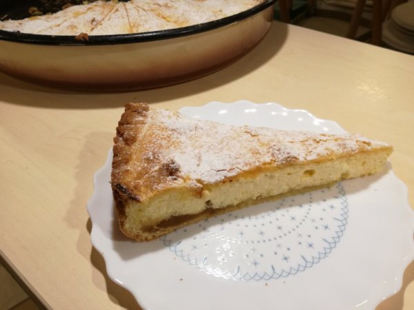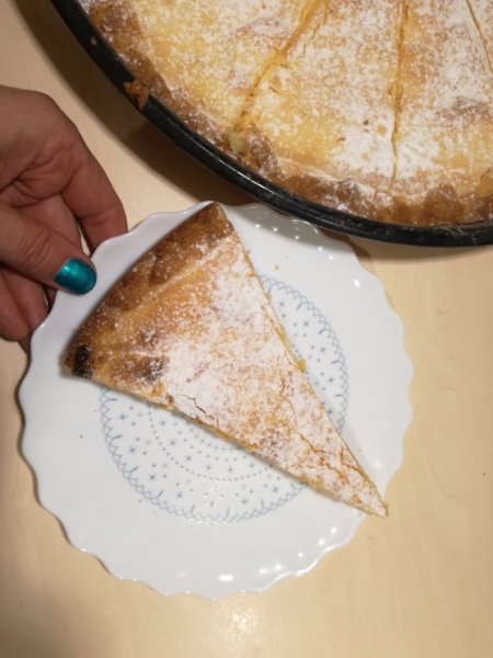 3. Ez a tésztamennyiség a szokásos nagyméretű tepsihez pont jó, de nekem van egy negyven centi átmérőjű zománcozott sütőedényem, ebben készítettem el. A formát kivajaztam, liszteztem; kinyújtottam a nagyobb darab tésztát, a formába tettem úgy, hogy pereme is legyen; elterítettem benne a tölteléket, majd befedtem a másik kinyújtott tésztadarabbal. A széleket összedolgoztam, a tetejét megszurkáltam villával, és 180 fokos sütőben úgy 35 perc alatt megsütöttem.