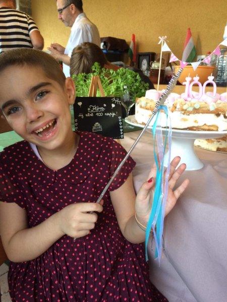 Kis kedvencünk, Flórika, aki tavasszal csontvelő-átültetésen esett át, új életének századik napját ünnepelte a mi tortánkkal.