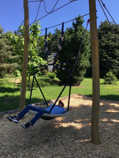 A bejárathoz közel egy jópofa játszóteret találtunk, hétfő lévén nem volt ott senki, úgyhogy váltva feküdtünk a pókos hintában, és fogadkoztunk, hogy el nem mozdulunk innen mostanában.