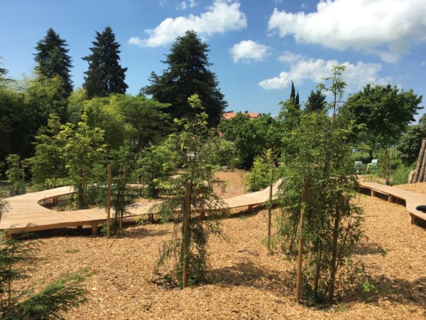 Ez pedig a jövőnek készül: a növények még kicsik, de néhány év múlva értelmet nyer a köztük kígyózó fa járda.