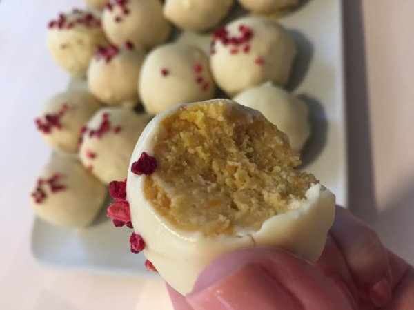 Összegyúrtuk némi darált keksszel, bevontuk fehér csokival, és megszórtuk kevéske liofilizált málnával. Nem mondom, hogy ez a világ leggazdaságosabb sütigolyója.