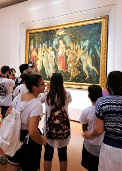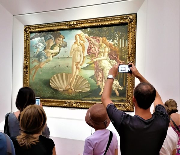 A dómhoz az Uffizi képtár egészen közel van. Bár azt olvastam, hogy ott mindig kígyózó sorok állnak, meg órákon keresztül, mi nem találtunk tömeget, így – bár csökkentett létszámban, nem akart mindenki – bementünk. Megnéztünk pár világhírű alkotást, köztük például Botticelli: Vénusz születését…