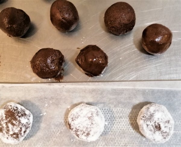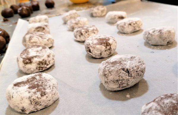 4. Ha már tudunk belőle golyókat gyúrni, akkor lássunk neki: mi 4 dkg-os , a diónál kicsit nagyobb golyókat formáztunk a masszából, porcukorba forgattuk őket, és kicsit meglapítva a sütőpapírral borított sütőlemezre helyeztük.