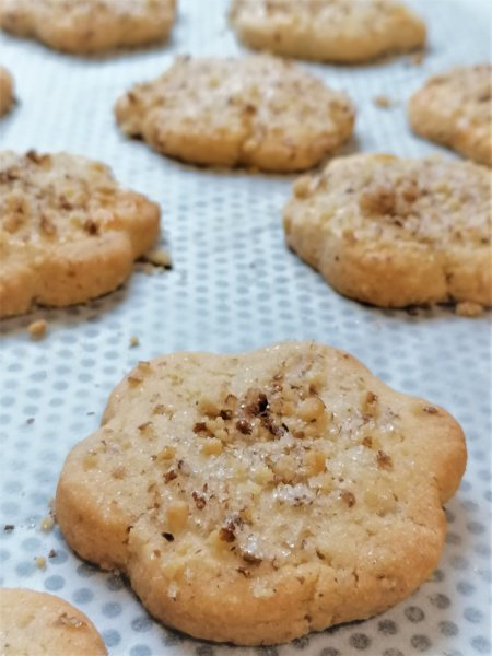 2. Nyújtsuk ki a tésztát kb. egy centi vastagra, majd szaggassunk belőle tetszőleges formákat. A nyers tésztadarabokat kenjük meg tojással, és mártsuk meg a cukros dióban/mogyoróban, és tegyük sütőpapírral borított tepsire.