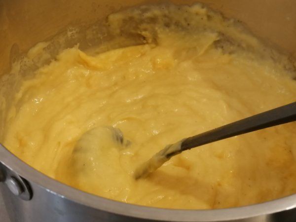 3. Jöhet a krém. Öntsük egy lábasba a tejet fél deci kivételével, tegyük a tűzhelyre, és kezdjük forrósítani. Keverjük össze egy műanyag tálban a tojássárgát a cukorral és a keményítővel, a fél deci tej segítségével. Amikor forr a tej, sűrítsük be ezzel a keverékkel. Azonnal kapcsoljuk le alatta a lángot, és habverővel keverjük simára a krémet. Ne felejtsük ki a vaníliát.