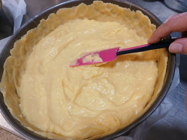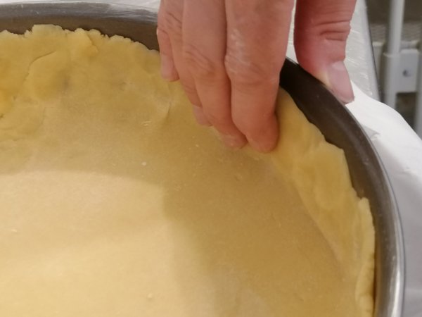 4. Egy 27 centi átmérőjű kapcsos tortaforma alját béleljük ki sütőpapírral. Nyújtsuk ki a 2/3-ad mennyiségű gombócot akkorára, hogy úgy tudjuk a formába helyezni, hogy körben legyen kb. 3 centi magas pereme. Ezt a tésztaperemet nyomkodjuk hozzá a karikához.
