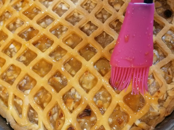 7. Még forrón kenjük le a szintén forró lekvárral, hogy később se száradjon ki az alma a rácsok között.