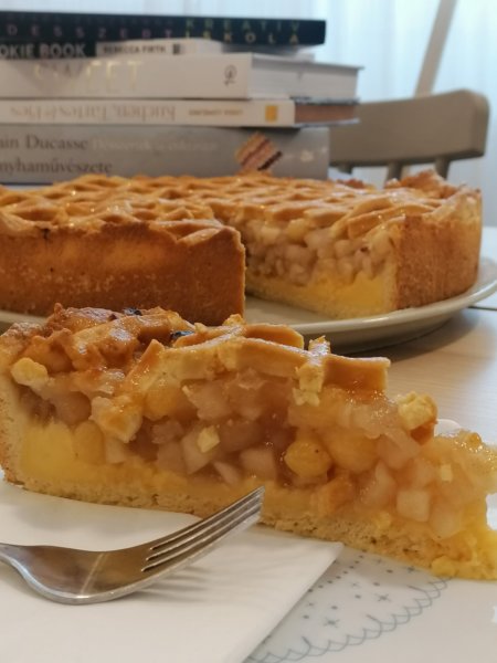 30 cm-es a tortasütő formám ezért 1 és 1/2 adag készült a tésztából. Elkészült az almás és a vaníliás krém, szépen kibéleltem a sütőformát. betöltöm a vaníliás krémet közben megkóstoltam és aztaaaa….. ehetetlenül sós a krém. Cukor helyett sót tettem bele. Aztán a rácsozás sem sikerült, ugyan van ez a rácsozó szerszámom, de mégsem sikerült. Most várom hogy kihűljön hogy megkóstolhassam, mert ennek a sütinek isteni finomnak kell lennie ennyi bénázás után.