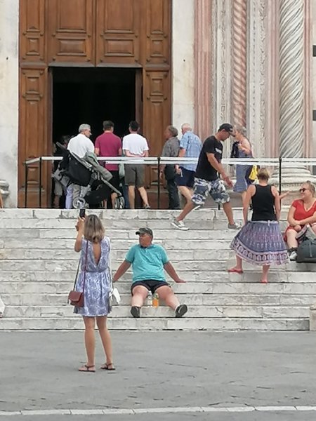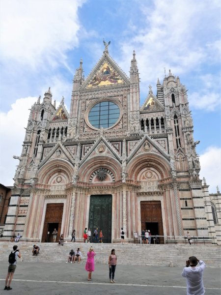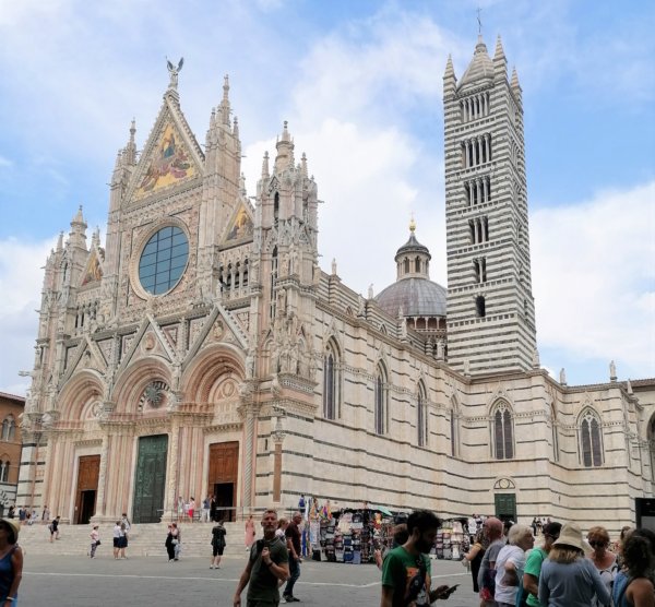 Szóval sétálgattunk, sétálgattunk, és egyszer csak a dómnál találtuk magunkat. A bejáratával szemben helyezkedik el a legrégebbi középkori kórház épülete, a Santa Maria della Scala, amelynek a lábazatát úgy alakították ki, hogy bemélyedéssel folytatódik a fal, vagy hogy is mondjam, a lényeg az, hogy fel lehet rá ülni nagyon kényelmesen, mi is ezt tettük, és innen szemléltük a híres fekete-fehér dómot, illetve a hömpölygő turistaáradatot. Nem volt kedvünk együtt hömpölyögni, ám üldögélni, nézelődni, beszélgetni kicsit annál inkább.