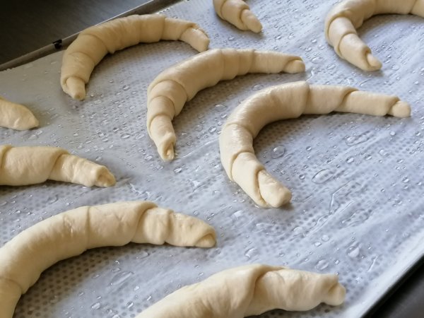 4. Sütés. A megformázott kifliket sütőpapírral borított sütőlemezre teszem (tepsire), és lespriccelem vízzel. Bekapcsolom a sütőt 210 fokosra, és én egy ideje már úgy csinálom, hogy egyből be is teszem a tepsit, amíg melegszik a sütő, addig kel a tészta.