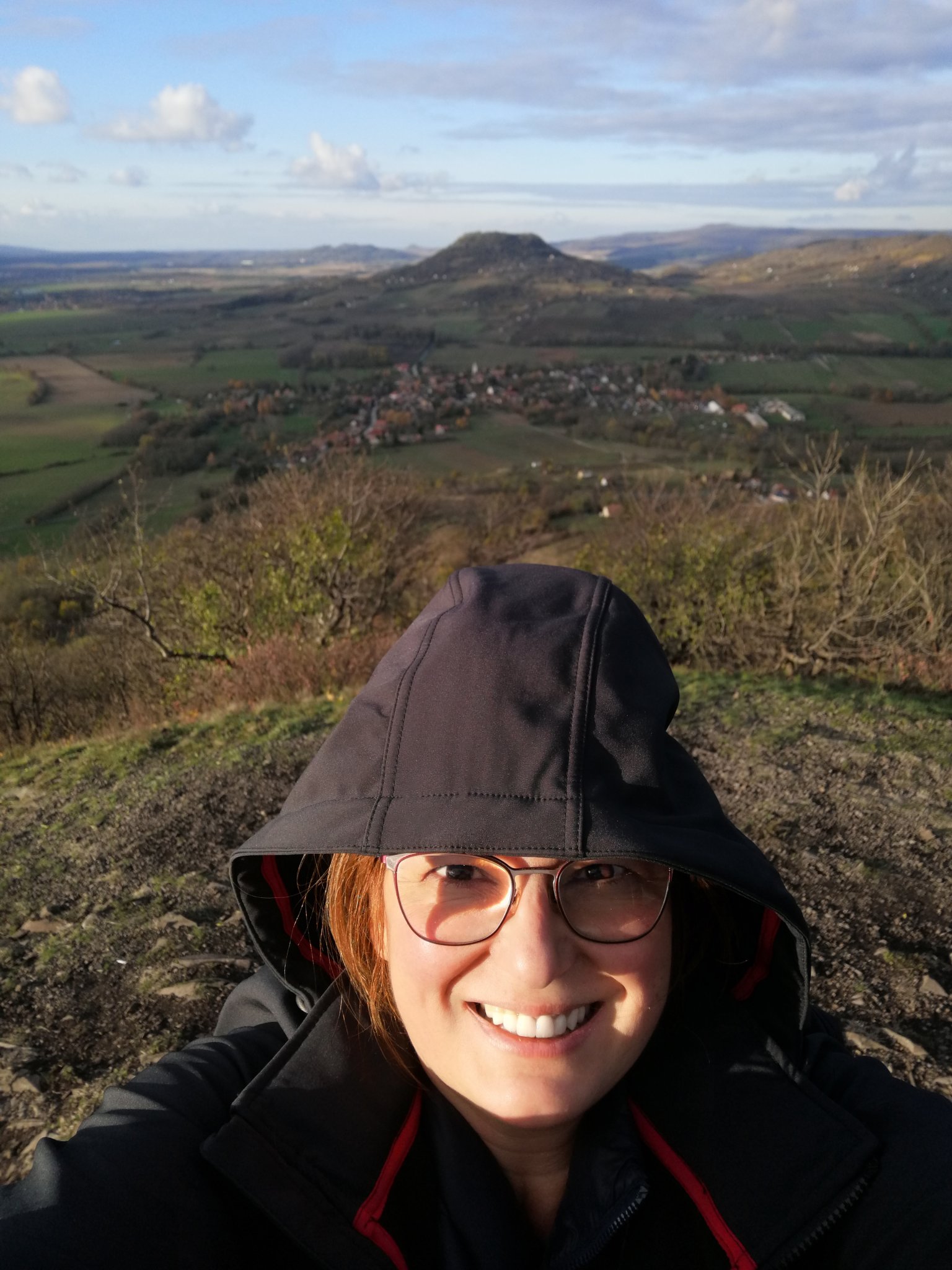 A következő képen pedig nagyon örülök annak, hogy végre nem fújta a szél az arcomba az összes hajamat, és hogy lefényképezhettem magam a hátam mögött a Csobánccal, sőt, ha kicsit jobban megnézitek a képet, a Csobánctól balra látható a Haláp-hegy, amelyről a múltkor áradoztam annyit.