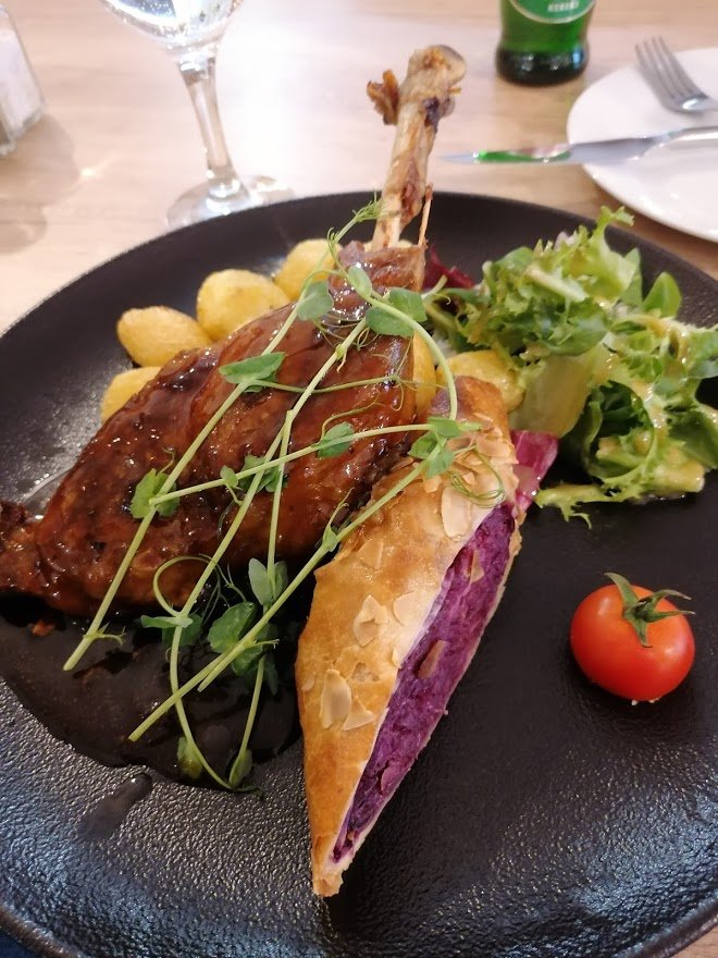 Nem szépítem, félelmetesnek éreztem akkor ott, egyedül – vagyis Mancival -, úgyhogy a csúcsra mászás előtt megfordultam, mert hát minek is másszak fel, gondoltam, úgysem látnék semmit. Inkább visszajövök legközelebb – folytattam tervem szövögetését, és el is döntöttem, hogy kihasználom az alkalmat, ha már úgyis erre járok, még egy jót eszem Badacsonyban a Borbarátokban, ki tudja, mikor jöhetek vissza legközelebb… November 9-e volt, a Márton-napi menüsor nemrég lépett életbe. Hát libacomb lett lila káposzta rétessel. Hamáregyszer.