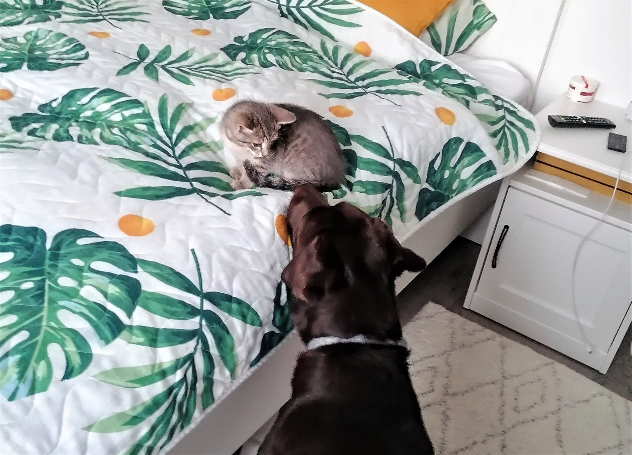 Második nap egy időre Pedrót egy másik szobába csuktam, Mancit pedig beengedtem oda, ahol addig tanyázott a cica, és ő azonnal bősz szaglászásba kezdett. Feldúltan mászkált össze-vissza, kereste a macskát, de hát persze, nem volt ott. Fél órán át biztos, hogy nyitva hagytam az ajtót, menjen csak, szagolgasson, ismerkedjen. Utána – nem Manci jelenlétében – Pedrót visszavittem a helyére, majd Mancit engedtem oda, ahol a cica átmenetileg tartózkodott. Ezt a nap folyamán többször is megismételtem. A nap vége felé Mancit pórázon tartva odaengedtük a macska közelébe, de hörögve rá akart rontani. Cica reszketve a függöny mögé el, Mancit pedig leszidtuk, és azonnal kicsuktuk a szobából, hogy értse meg, ha így viselkedik, nincs partizás.