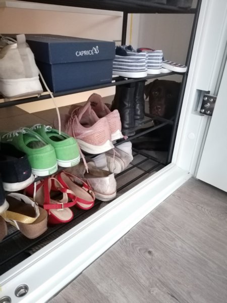 A reggeli szaglásztatás után, amikor Pedrót visszavittem a helyére, nem csuktam be az ajtót, de odatettem egy cipőspolcot az útba, amin Manci ugyan belátott, a macska meg ki, de a kutya nem tudott a szobába jutni.
