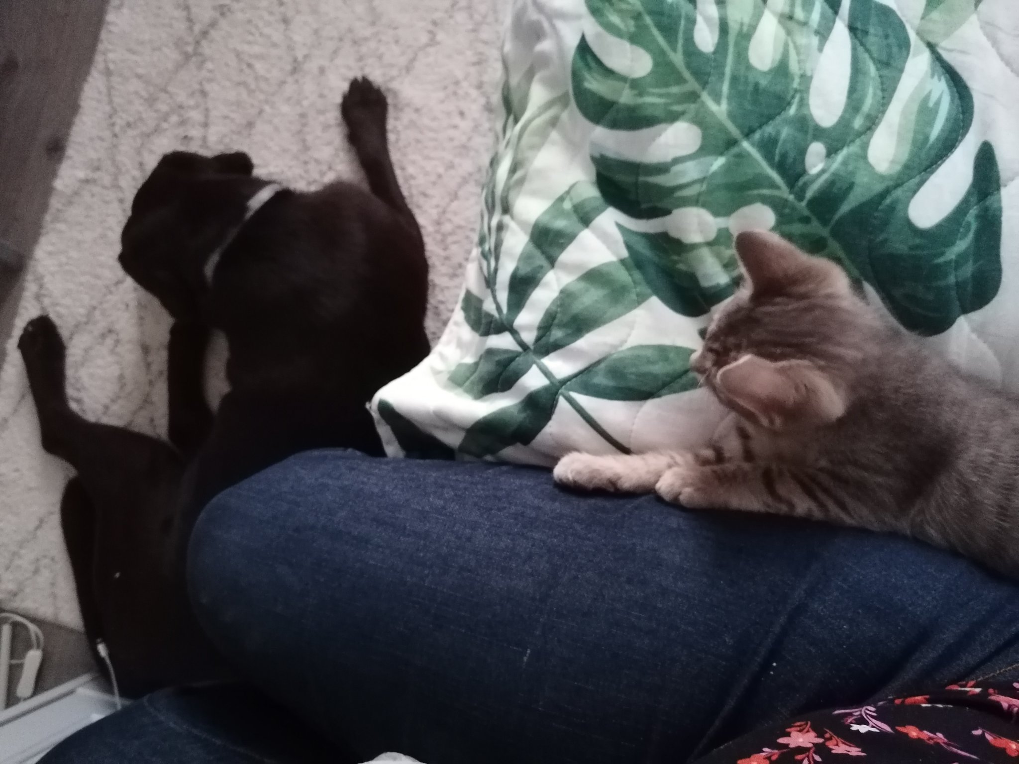 Ezen a napon – tudom, sokan helytelenítik, remélem, apám soha nem is fogja olvasni – a macskát a hálószobába engedtem, a franciaágyra. Mancit a nyakörvénél fogva beengedtük, és valahányszor meg akart ugrani a macska felé, erélyesen rászóltunk, hogy “nem szabad!”, és annyira erős volt benne a vágy, hogy szemügyre vehesse a kis jövevényt, hogy megzabolázta ösztöneit, leült, és hogy tudjuk, ez most milyen nehéz neki, időnként nyögött egy-egy nagyot. A macskát közelebb hoztam az ágy széle felé, simogattam, hogy azt érezze, biztonságban van – és Mancit is egyre közelebb engedtük (őt Zsófi tartotta, egyébként). A macska időnként megrettent, és egy díszpárna mögé rohant, de egy kis idő múlva kicsalogattam, és újrakezdtük a közelítő műveletet. Mancit folyamatosan dicsértük, hogy milyen okos, milyen ügyes, és tényleg nagyon igyekezett. Amikor a macsek hirtelen megijedt, és felugrott, Manci is akkor ugrott fel, amitől a macska méginkább megijedt – szóval, kellett nagyon a kontroll. De kitartottunk Zsófival, és egyre jobban ment a barátkozás. A macska már akkor is dorombolt, ha simogattam, de közben a kutya közel volt – és ezt mindenképpen haladásnak éreztem.