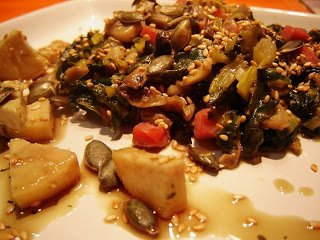 Kevés olajon kicsit dinsztelem az apróra vágott póréhagymát, majd rádobom a szintén apróra zúzott fokhagymát. Közben megmosom, és kis darabokra tépem a spenótot, ezt is hozzáadom. Kockára vágom a sonkát, és mehet a többihez. Ugyanígy teszek a gombával, és amikor a serpenyőbe tettem, egy fél citrom levét is rányomom. Ízesítem, fűszerezem, pár percig párolom. Addig pedig megpirítom a magokat.